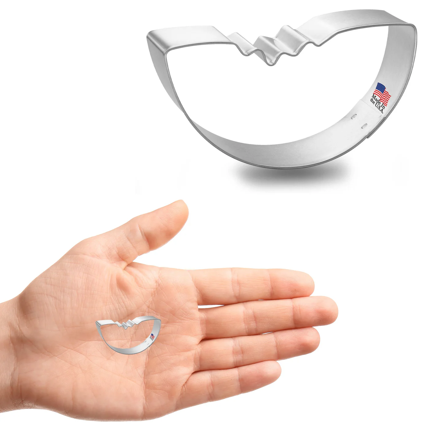 Miniature Watermelon Slice cookie cutter, made of sturdy tin, Size 1 5/8 in. long, 1/2 in. wide. Depth 1/2 in., Color silver